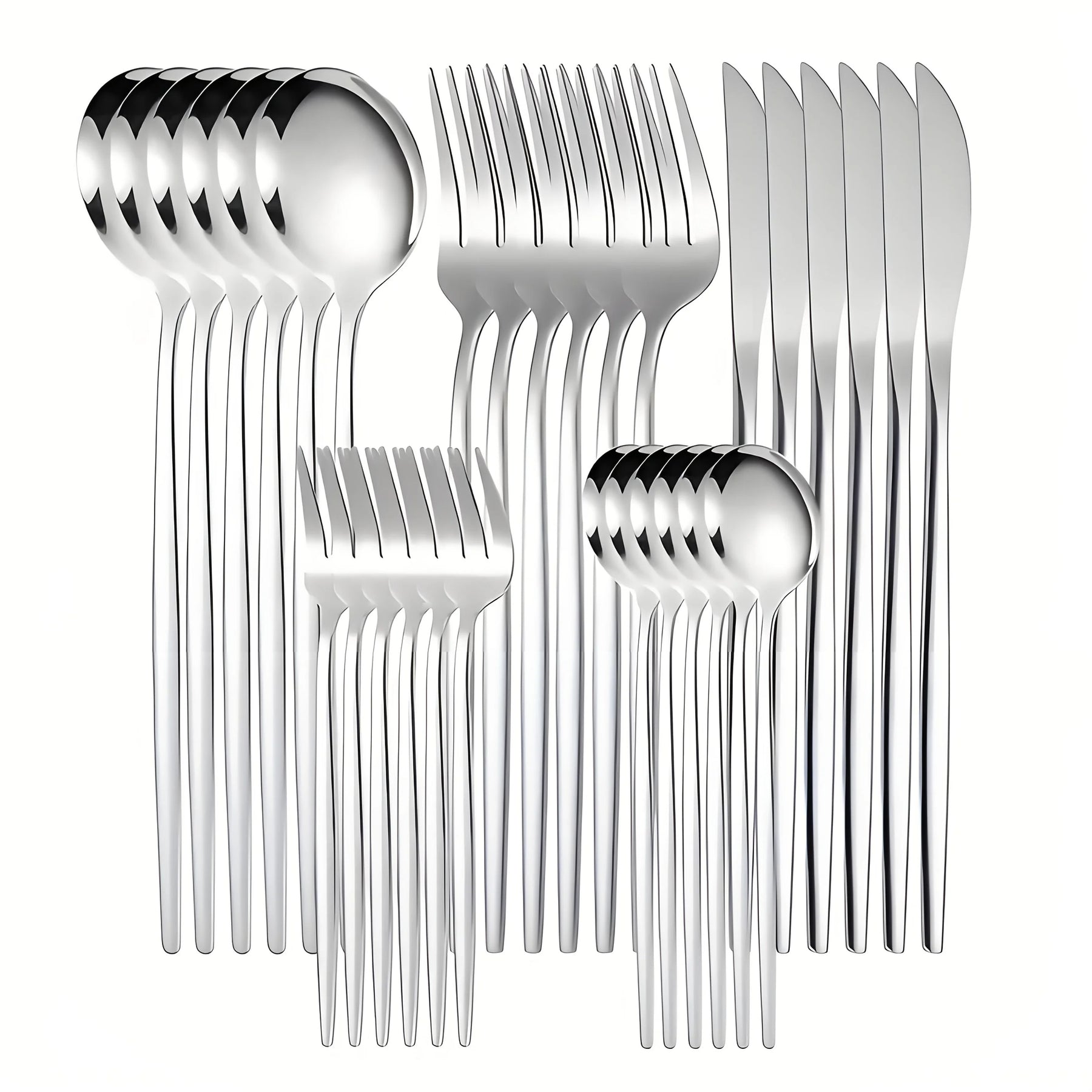 Premium 30-piece stainless steel cutlery set with spoons, forks & knives. Elegant golden or silver finish, rust-resistant 410 steel. Perfect for dining & gifting.